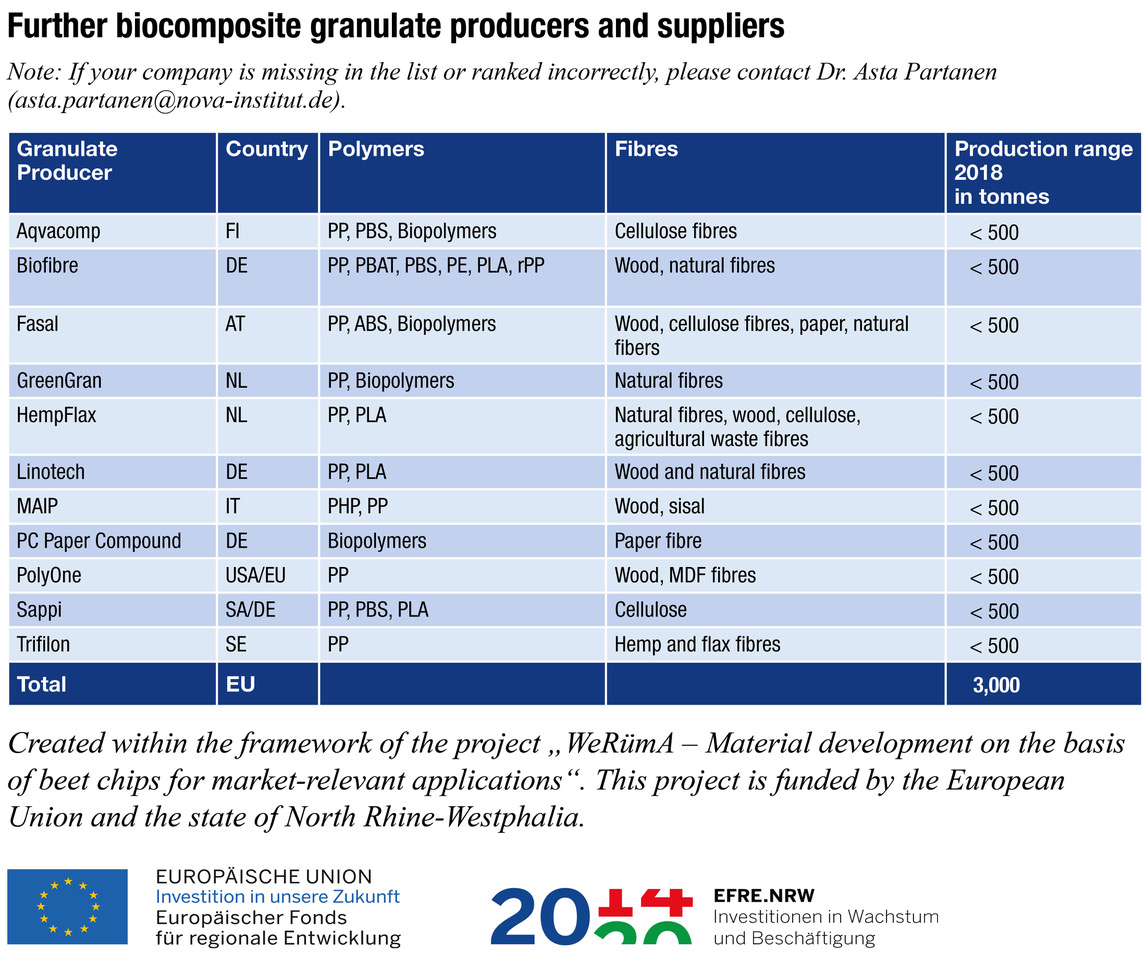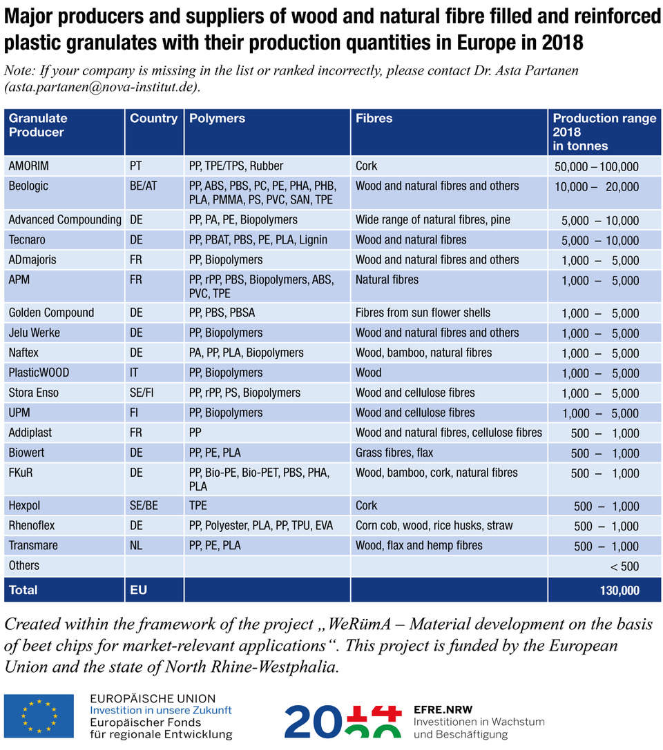 nova-Institute has now published a list of all European producers and suppliers of biocomposite granulates. The list includes 30 producers from nine different countries. The amount of granulates produced and sold in 2018 was almost 130,000 t. This is a considerable increase compared to previous years and double-digit growth is expected in the next few years.