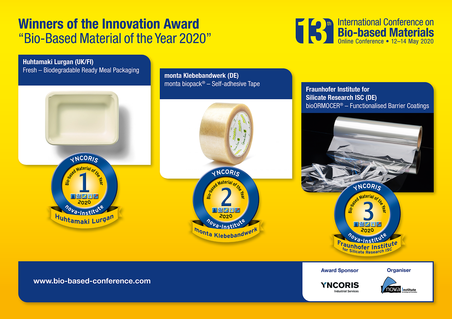 As in every year, the Innovation Award “Bio-based Material of the Year” was granted to the most innovative materials and products on the market. Six companies out of 17 applications were previously nominated by an expert jury and the nominees brought their innovative ideas via screen to the participants' homes. After the presentations of the six nominees, the winners were elected by the audience in an online poll and awarded with their prize, sponsored by YNCORIS Industrial Services (HĂĽrth, Germany). Here are the three winners in detail (see also Collage: Winners of the Innovation Award "Bio-based Material of the Year 2020"):Â