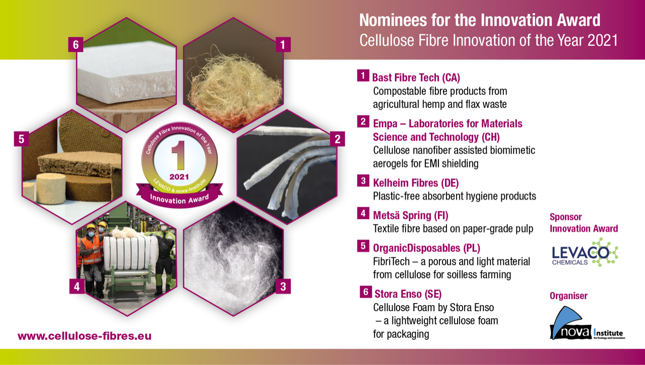 Another highlight at the conference will be the first Innovation Award “Cellulose Fibre Innovation of the Year”, sponsored by Levaco (DE)! The innovations submitted are a performance show of cellulose fibre: From cellulose foam for packaging over plastic-free menstrual products to EMI shielding materials, the nominated six applications can help build a sustainable economy. The six nominees will present their cellulose fibre technology or application on day one of the conference. Afterwards, the conference audience will elect the three winners of the title “Cellulose Fibre Innovation of the Year 2021”.