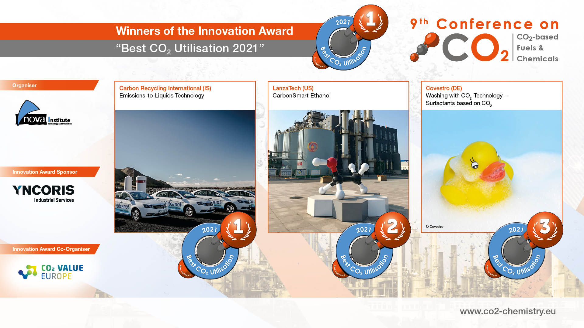 The innovation award was sponsored by YNCORIS (Germany), service partner for a future-proof chemical industry, and organised by nova-Institute (Germany) and CO2 Value Europe (Brussels), the only association exclusively dedicated to Carbon Capture and Utilisation (CCU).