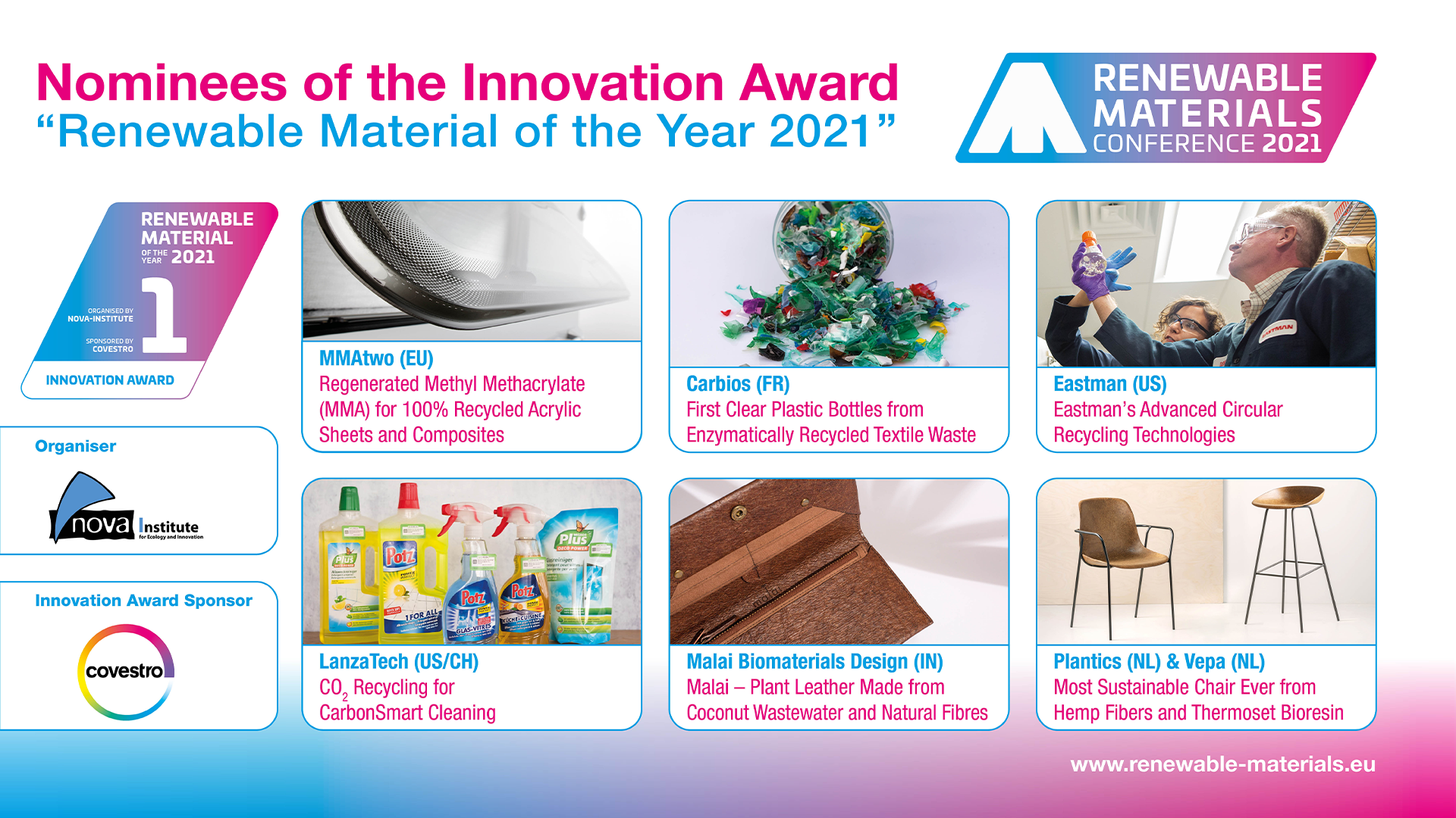 PRESS RELEASE (EN/DE): Three advanced recycling technologies, a CO2-based cleaner, plant leather and a hemp chair are nominated for the innovation award "Renewable Material of the Year 2021"