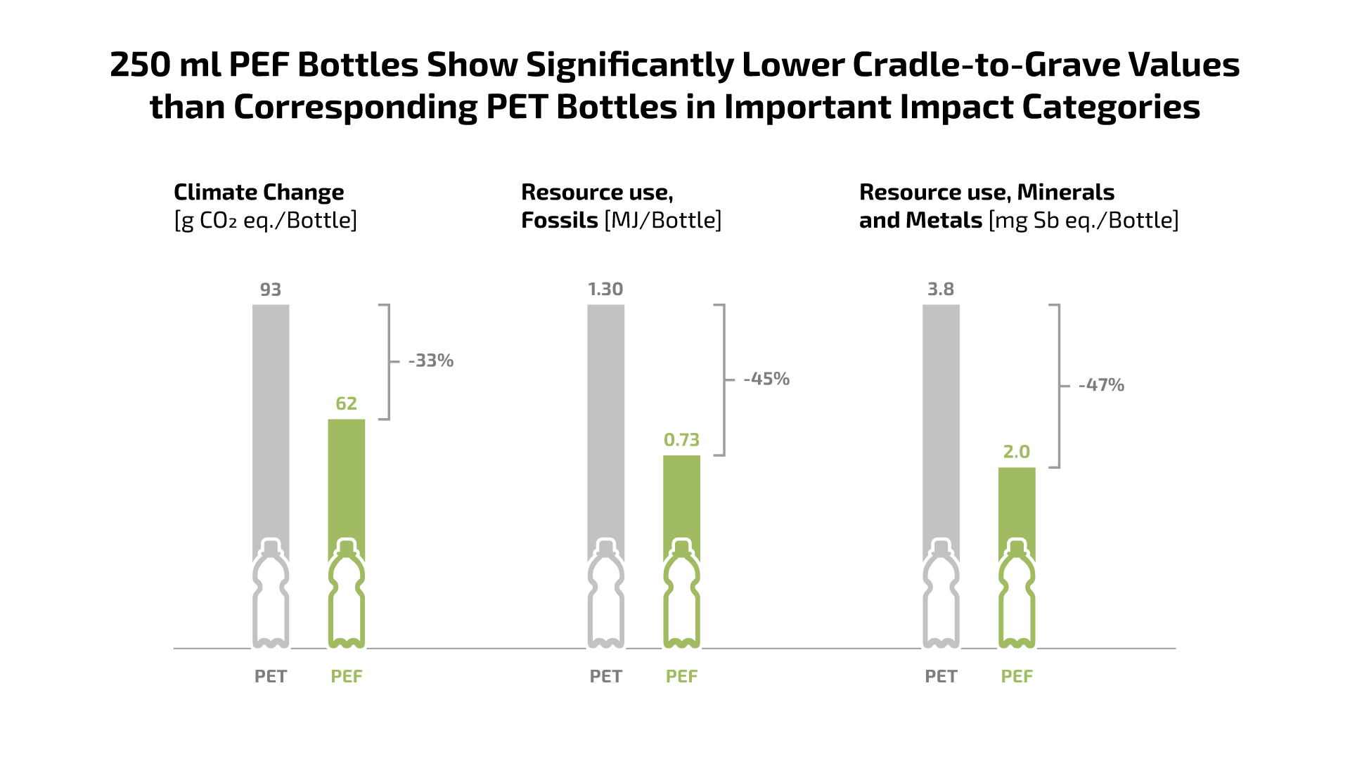 The LCA evaluated 16 different impact categories covering all relevant life cycle stages from cradle-to-grave. The comparative analysis showed that PEF bottles would result in significant reductions in greenhouse gas emissions (-33 %) compared to reference PET bottles. PEF would also lead to 45 % lower finite resource consumption of fossil fuels and reduce the pressure on abiotic resources (minerals and metals) by 47 % due to the mechanical properties of PEF enabling light-weighting. However, PET bottles would outperform PEF-bottles in other impact categories mostly arising from the current feedstock supply. Overall, this represents a benefit because climate change and resource use are among the most relevant environmental impact categories in the current political agenda. They are driving the transition from fossil to renewable carbon.Â