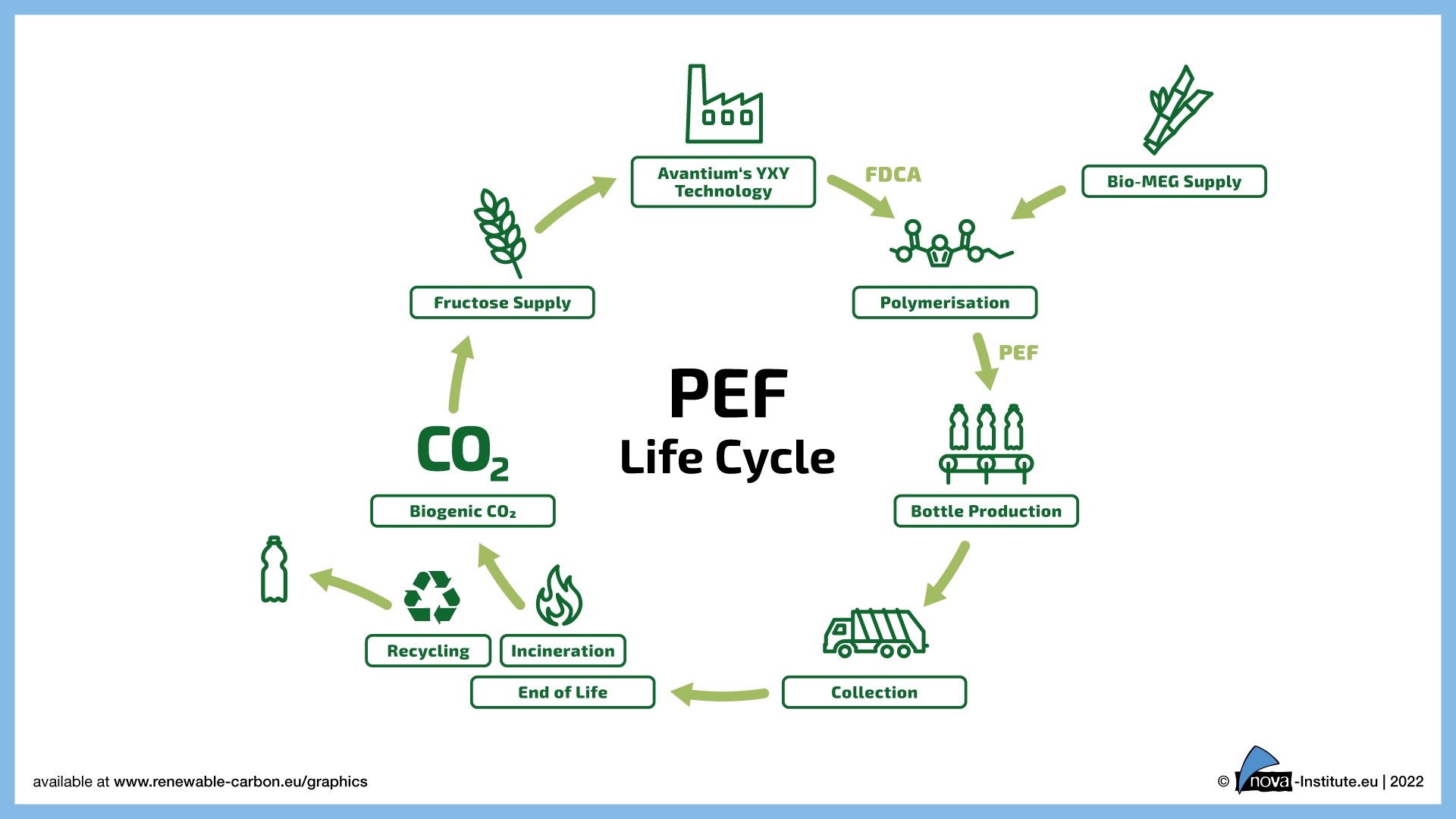 The Dutch company Avantium has developed a technology (YXY®) to convert plant-based sugars into a fully recyclable polymer. The new 100 % bio-based polymer, PEF (polyethylene furanoate) has superior performance properties compared to PET (polyethylene terephthalate). The main building block of PEF, FDCA (2,5-furandicarboxylic acid) can be produced from sugars (fructose), for example from wheat, corn and sugar beet. FDCA is polymerised with plant-based mono-ethylene glycol (MEG) to make a 100 % plant-based PEF polymer. When fully technologically developed, PEF can also be produced from cellulose and thus from agricultural and forestry waste streams. Avantium’s current process utilises starch from European wheat. PEF has enhanced barrier properties compared to PET, it is mechanically and chemically recyclable and can also be recycled within the established PET recycling. PEF has a 12 °C higher heat resistance than PET, a 60 % higher modulus and greater strength than PET. This allows the developing of lightweight packaging from PEF with lower resource requirements. Avantium has already implemented this innovative, plant-based packaging material on a pilot scale and recently started the construction of a 5,000-tonnes-per-year FDCA flagship plant in Delfzijl (the Netherlands). The nova-Institute’s peer-reviewed LCA indicates a significant reduction potential in greenhouse gas emissions and use of fossil resources of PEF compared to PET.