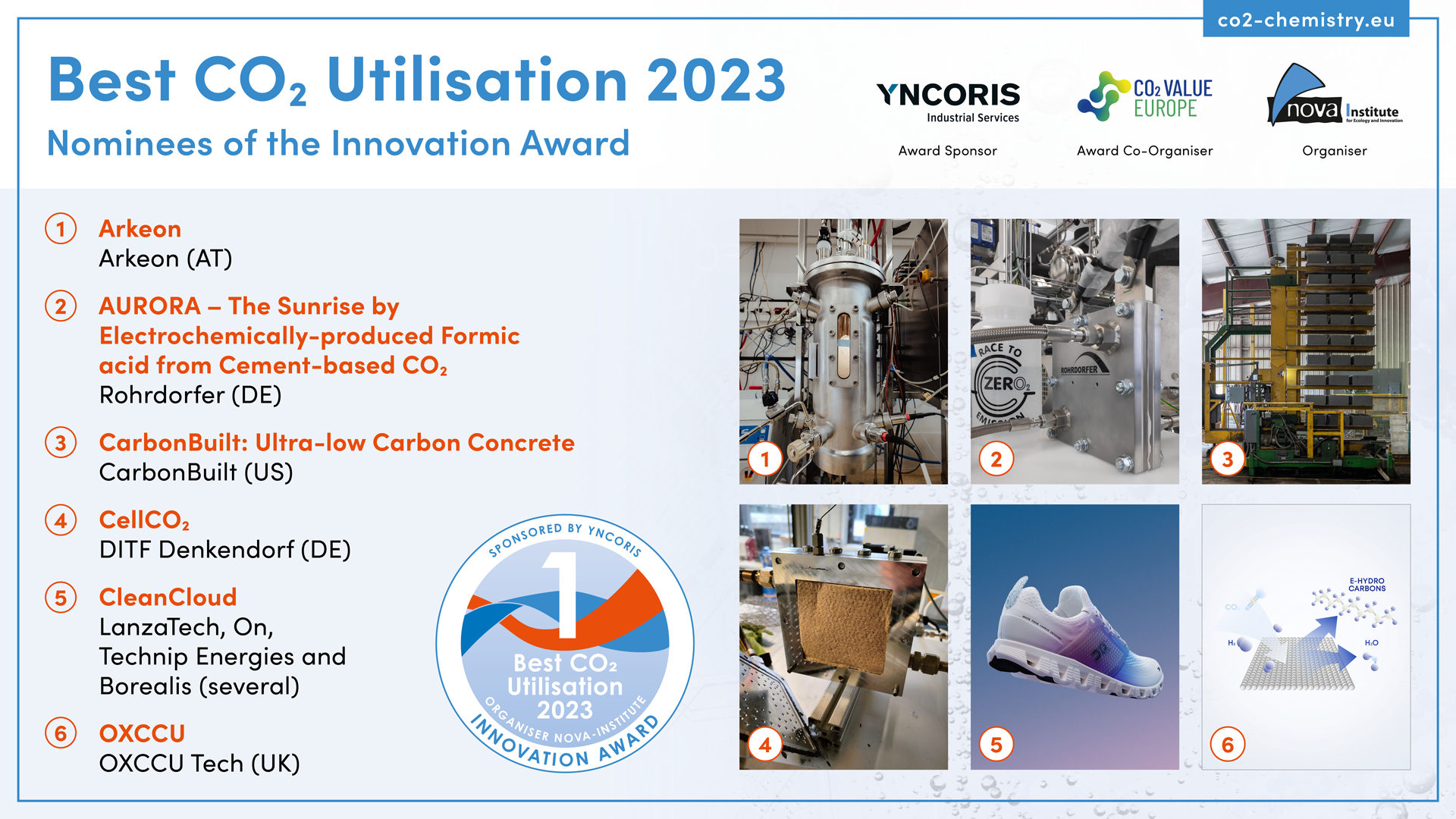 The Conference on CO2-based Fuels and Chemicals announces six nominees for the innovation award “Best CO2 Utilisation 2023”.