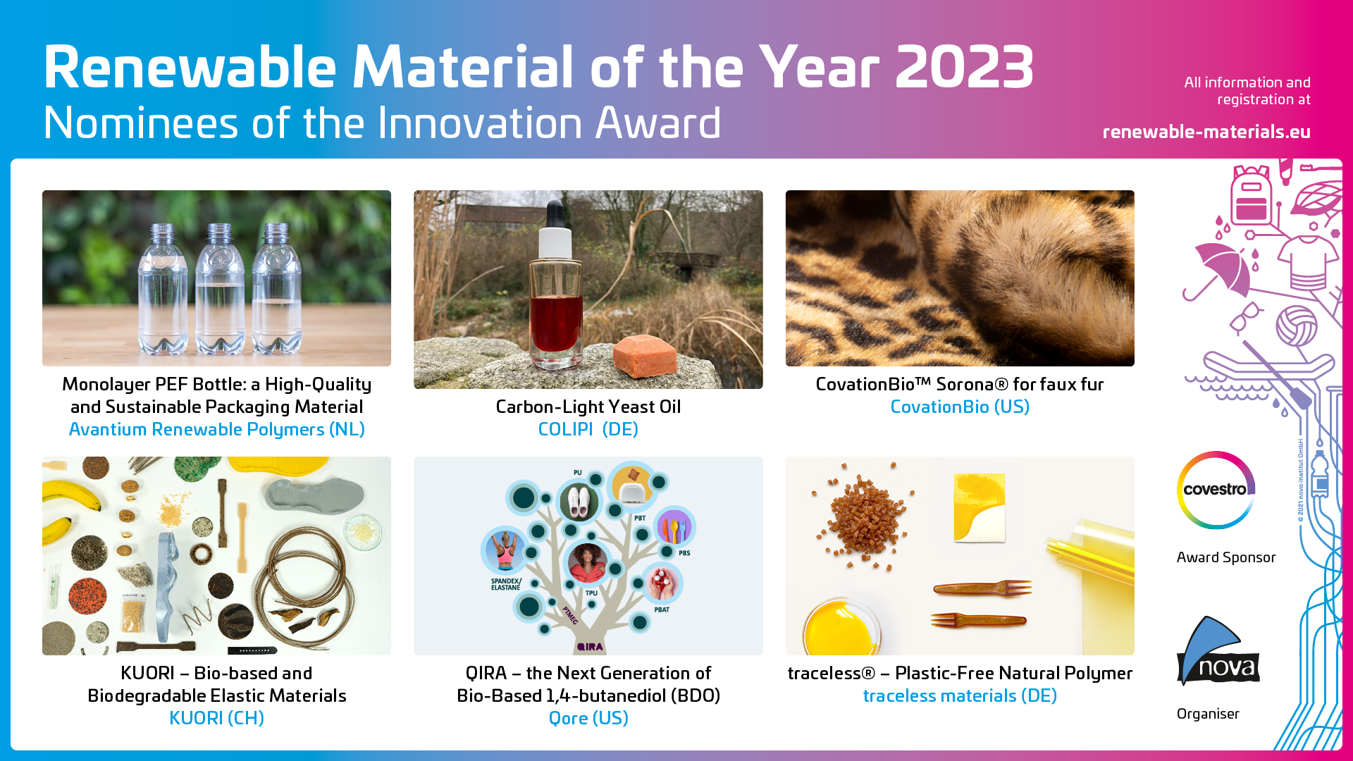 With the innovation award “Renewable Material of the Year 2023”, nova-Institute, as organiser, and Covestro, as sponsor, want to recognise particularly exciting and promising solutions that contribute to replacing fossil carbon from the ground. The call for submissions was answered by 30 companies. The advisory board and the nova experts had a hard time selecting the six most exciting and nominating them for the award.