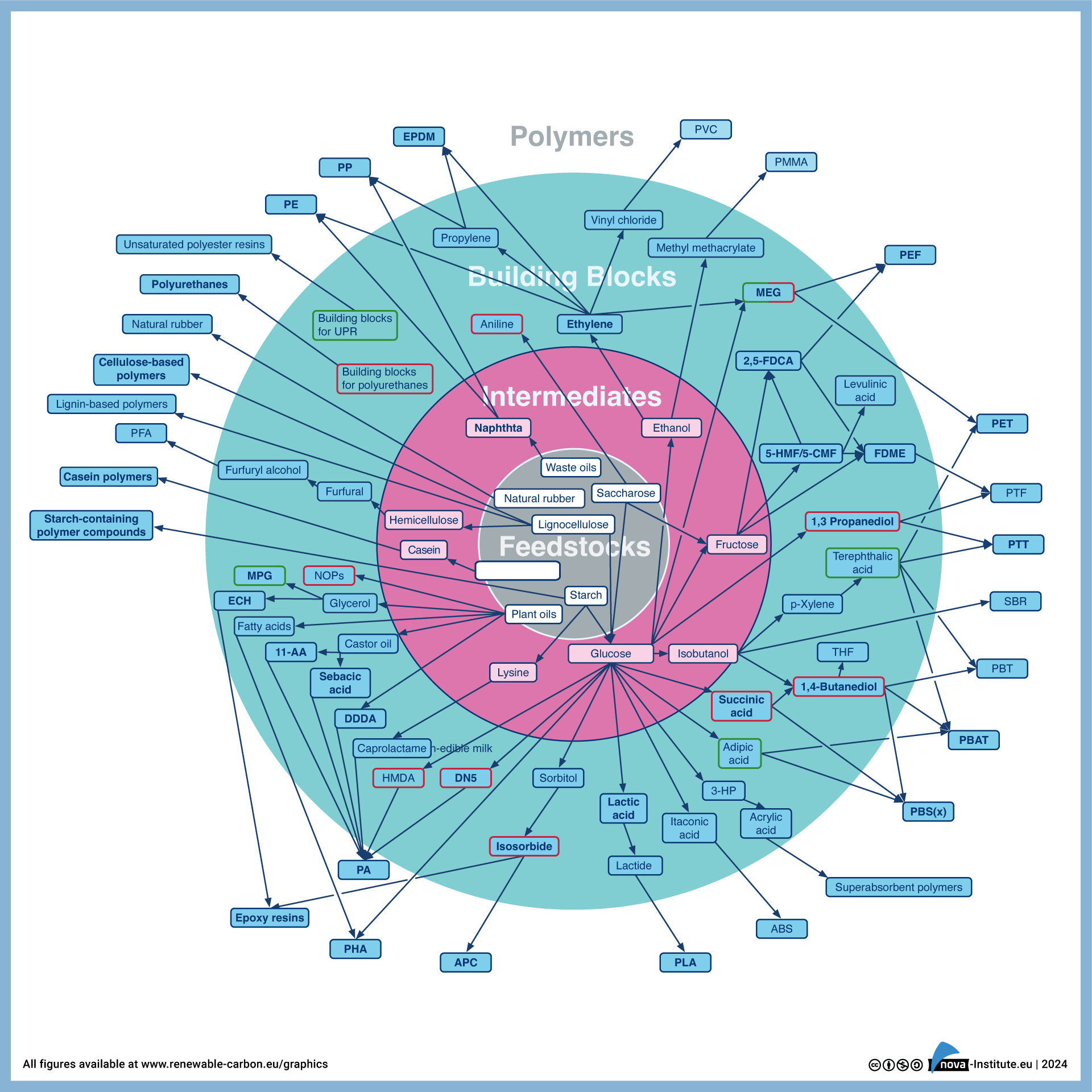 The data published annually by European Bioplastics and the data published by Plastics Europe for 2022 are taken from the market report published by the nova-Institute, albeit with a smaller selection of bio-based polymers and application areas in each case.