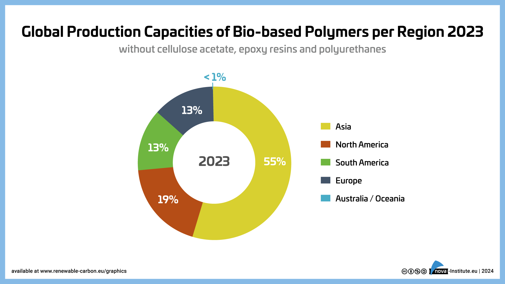 The most important market drivers in 2023 were several global brands that adapted their strategic agenda to transition the polymers, plastics and chemicals industry to become sustainable, climate‑friendly and part of the circular economy, thus offering their customers environmentally friendly solutions and critical consumers alternatives to petrochemical products. The only way for this successful transition is the complete substitution of fossil carbon with renewable carbon from alternative sources: biomass, CO2 and recycling (http://www.renewable-carbon.eu). By expanding their feedstock portfolio to include, next to fossil‑based, renewable carbon, these brands strike the rethinking from the market point of view. Especially in the use of biomass, this rethinking increased and will further increase the supply of bio‑based as well as biodegradable polymers. Nevertheless, the market remains challenging in terms of crude oil prices and from a political perspective, as major advantages of bio‑based polymers have not been politically rewarded yet: 1) Bio-based polymers replace fossil carbon in the production process with renewable carbon from biomass. This is indispensable for a sustainable, climate-friendly plastics industry and, 2) Biodegradability is offered by almost the half of the produced bio-based polymers. This should only be a solution for plastics that cannot be collected and enter the environment. In these situations, they can biodegrade without leaving behind microplastics. Only two countries, Italy and Austria will politically support this additional disposal path.