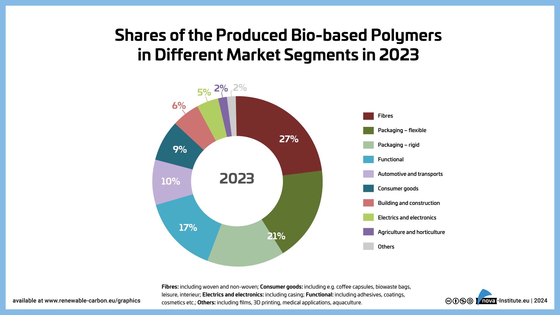 Today, bio‑based polymers can be used in almost all market segments and applications, but the various applications per polymer can be very different. Figure 9 shows a summary of the applications for all bio‑based polymers covered in the report. In 2023 fibres including woven, non‑woven (mainly CA and PTT) had the highest share with 27 %. Packaging, flexible and rigid, had a 21 % share in total, followed by functional applications with 17 % (mainly epoxy resins and PUR), automotive and transport with 10 % (mainly PA, epoxy resins and PUR) and consumer goods with 9 % (mainly PA, epoxy resins and PLA). Building and construction had a 6 % share (mainly epoxy resins and PUR) and electrics and electronics 5 % (mainly epoxy resins and PA). The market segments agri‑ and horticulture and others had a market share of 2 %, respectively.