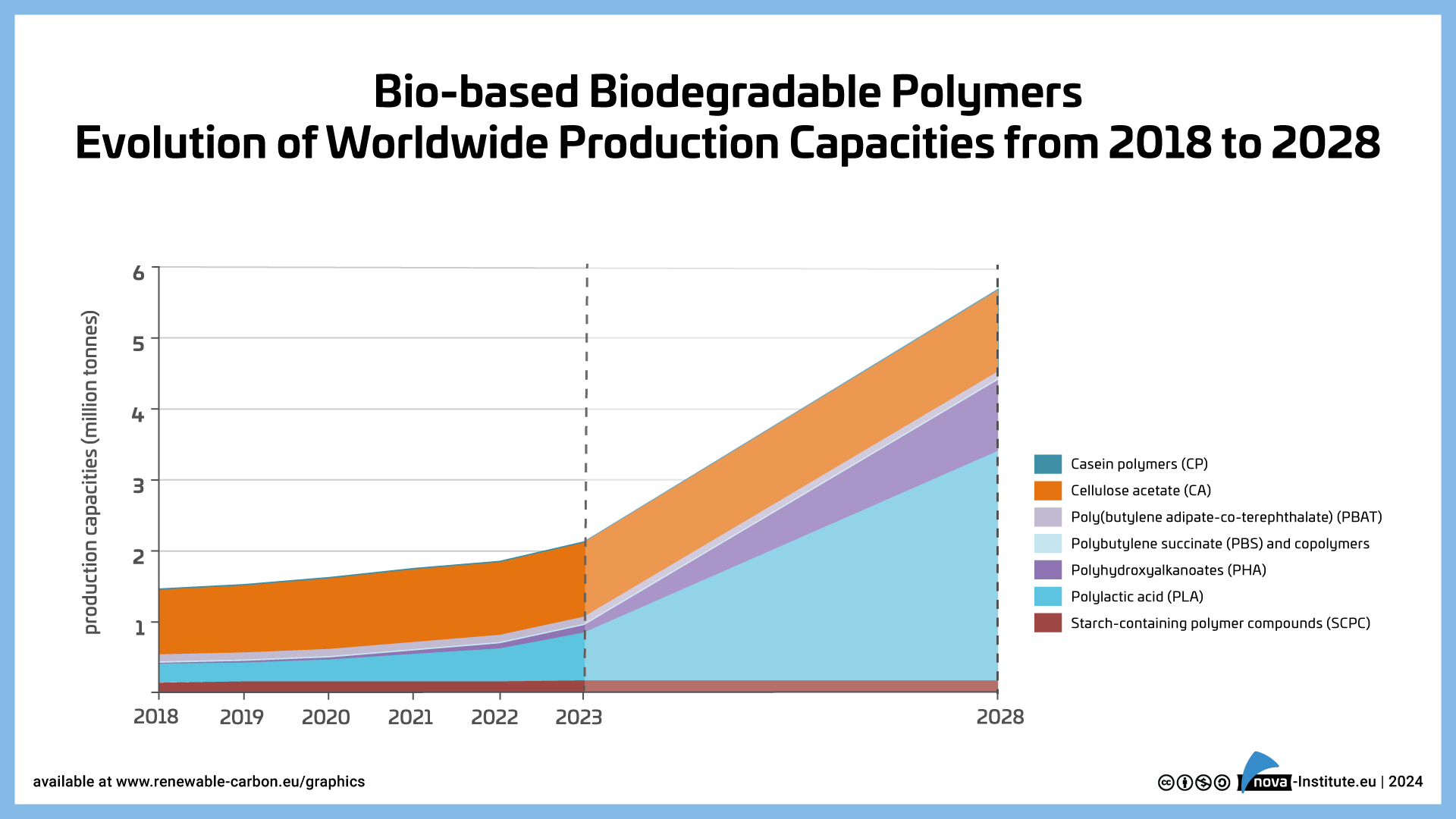 The new market and trend report “Bio‑based Building Blocks and Polymers – Global Capacities, Production and Trends 2023–2028”, written by international biopolymer expert group of the nova-Institute, shows capacities and contains production data for 17 commercially available, bio‑based polymers in the year 2023 and a forecast for 2028. The report is now available in full length as well as a freely available short version here: https://renewable-carbon.eu/commercial-reports.Â