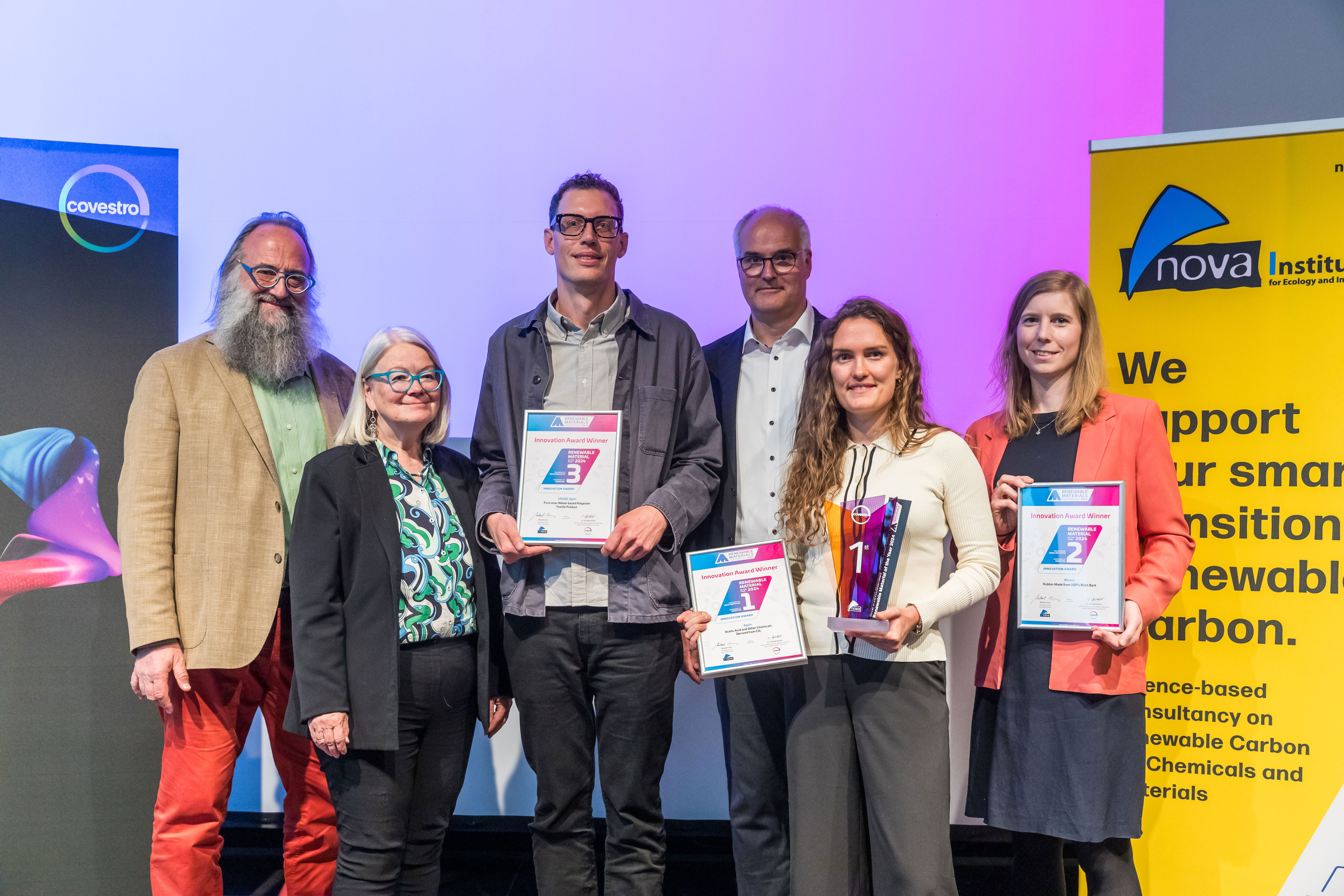 For the fourth time, the innovation award “Renewable Material of the Year” was granted for the development of new technologies and applications, which combines all renewable material solutions in one competition – from biomass and CO2 utilisation to recycling. Six innovations were nominated by a panel of experts from 38 submissions. After 10-minute presentations by the nominees, the participants chose the winner. The innovation award was organised by the nova-Institute and sponsored by Covestro (Germany). The three winners in detail: