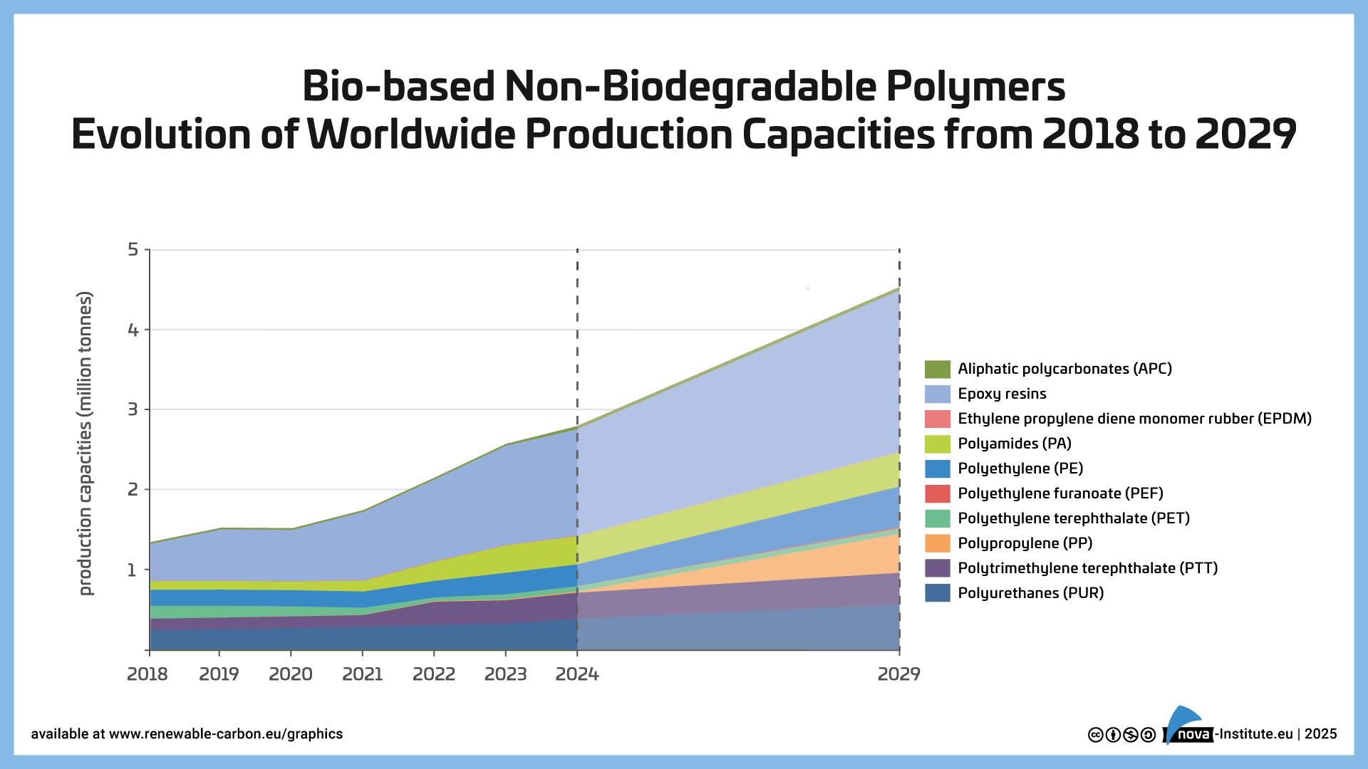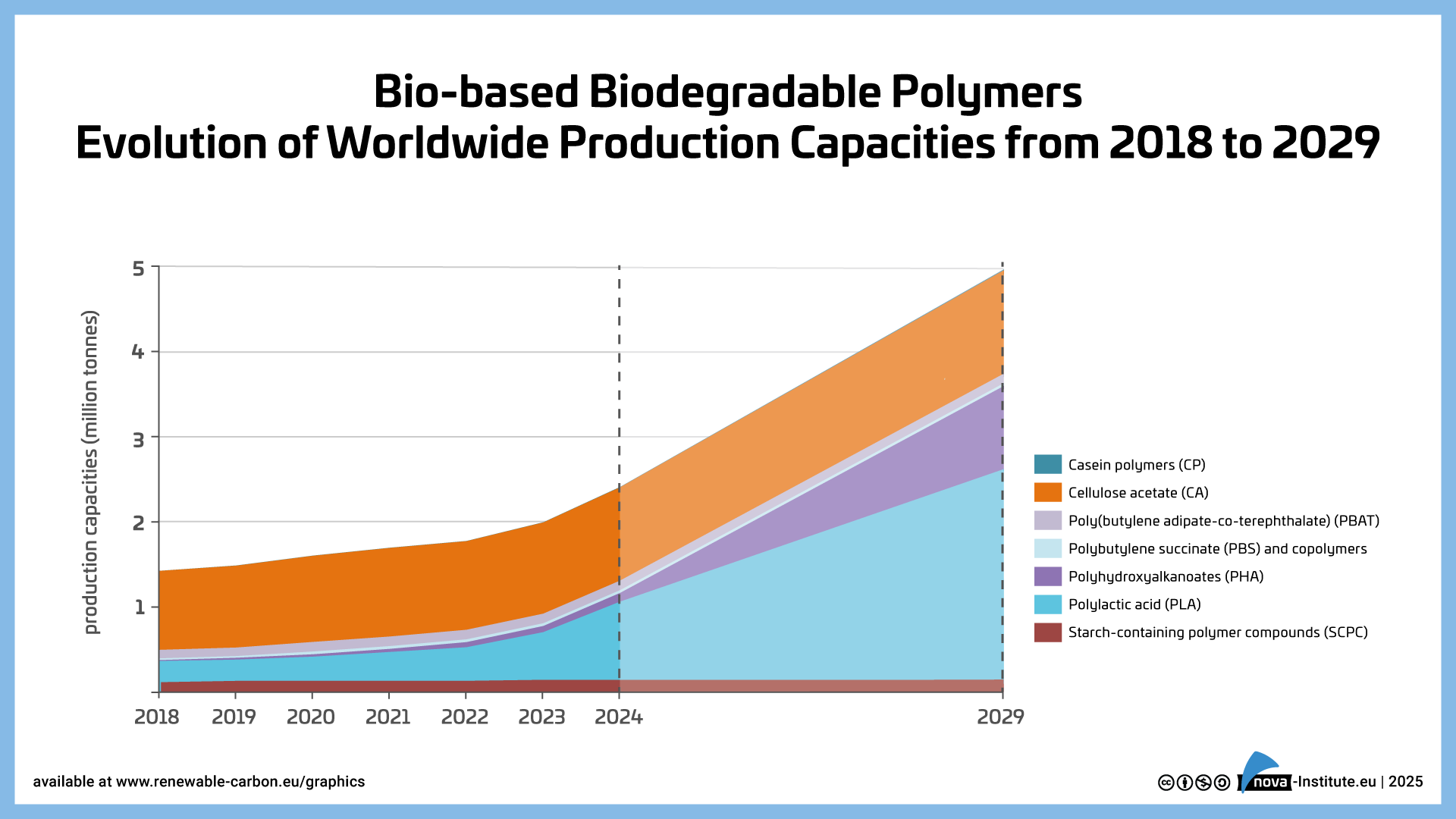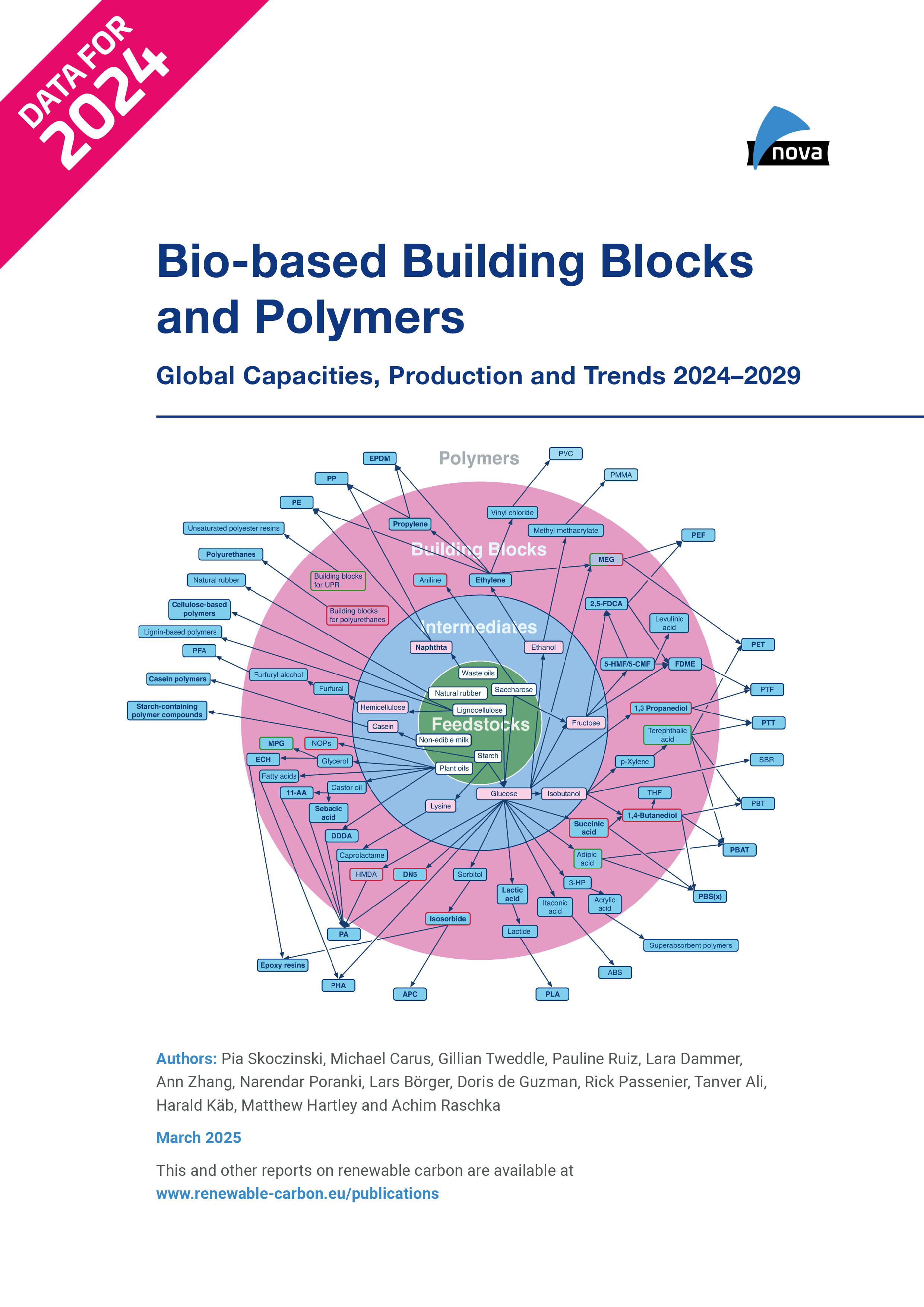 Hürth, 18 March 2025: The new market and trend report “Bio‑based Building Blocks and Polymers – Global Capacities, Production and Trends 2024–2029”, written by the international biopolymer expert group of the nova-Institute, shows capacities and production data for 17 commercially available, bio‑based polymers in the year 2024 and a forecast for 2029. The full report for € 3.000 and a free short version are now available here: https://renewable-carbon.eu/commercial-reports