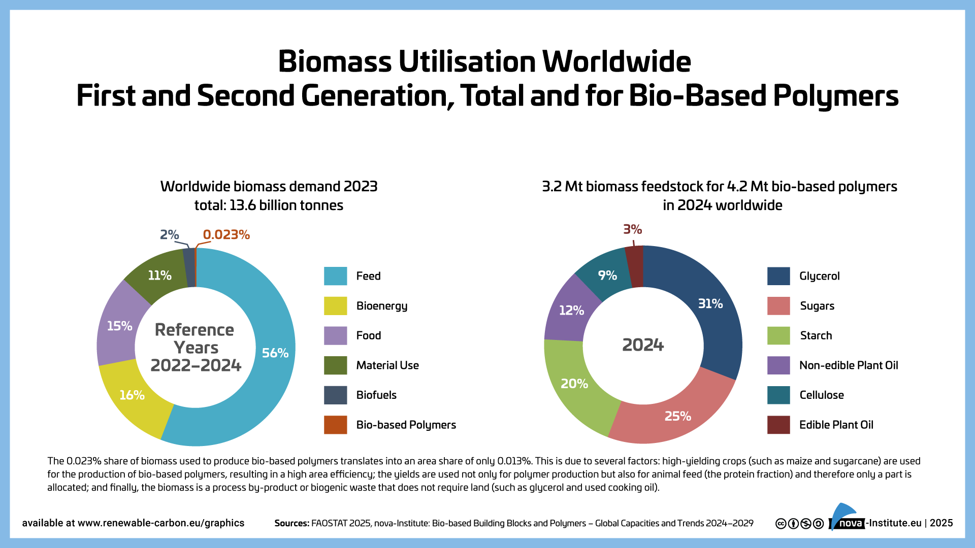 Considering the steadily increasing demand for bio‑based polymers, the need for biomass feedstocks should be considered as an important factor. This is particularly true for the recurring debate on the use of food crops for the production of bio‑based polymer. The total demand for biomass was 13.6 billion tonnes for feed, bioenergy, food, material use, biofuels as well as bio‑based polymers. While the majority of biomass (56%) is used for feed production, only 0.023% is required for the production of bio-based polymers (Figure 3). This results in a biomass feedstock demand of 3.2 million tonnes for the production of 4.2 million tonnes of bio-based polymers and reflects a land use share of only 0.013%. This is due to the fact that the main feedstocks used in the production of bio-based polymers are sugars (25%) and starch (20%), which are obtained from high-yield crops such as sugar cane and maize, resulting in a high area efficiency.