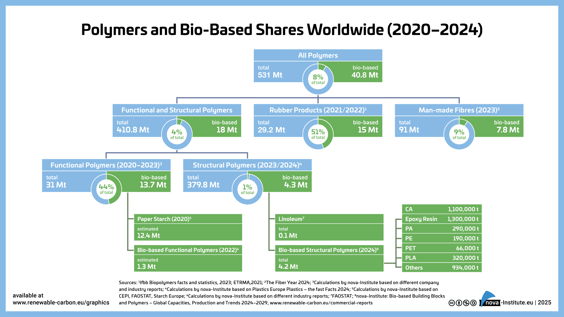 The just released, annually updated market report by nova-Institute includes the following features on 434 pages: Coverage of 17 bio-based building blocks and all 17 commercially available bio-based polymers, comprehensive information on the capacity development from 2018 to 2029, as well as production data for the years 2023 and 2024, per bio-based polymer and analyses of market developments and producers per building block and polymer, allowing readers to quickly gain an overview of developments that go far beyond capacity and production figures. In addition, the market study includes a statistical report on “Mass Balance and Attribution (MBA)” products available worldwide, based on an extensive analysis of the ISCC database, a detailed review of current European policy landscape for bio-based polymers, as well as a comprehensive summary of biodegradability and biodegradable polymers. This information is supported by 60 figures, 50 tables and 218 company profiles.