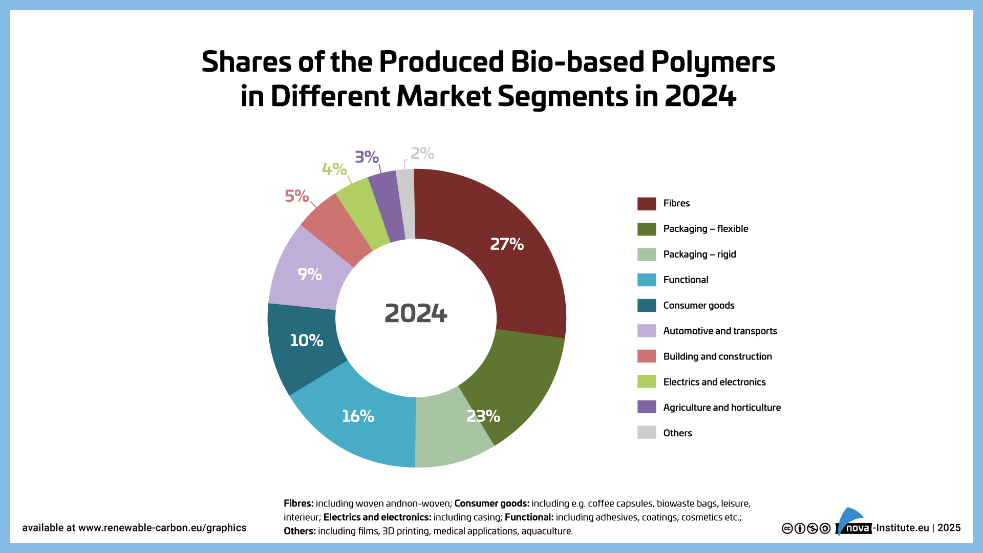 Today, bio‑based polymers can be used in almost all market segments and applications, but the different applications per polymer can be very different. Figure 9 shows a summary of the applications for all bio‑based polymers covered in the report. In 2024 fibres including woven, non‑woven (mainly CA and PTT) had the highest share with 27 %. Packaging, flexible and rigid, had a total share of 23 %, followed by functional applications with 16 % (mainly epoxy resins and PUR), consumer goods with 10 % (mainly epoxy resins, PLA and PA) and automotive and transport with 9 % (mainly PUR, PA and epoxy resins). Building and construction accounted for 5 % (mainly epoxy resins and PUR) and electrics and electronics for 4 % (mainly epoxy resins and PA). The market segments agri‑ and horticulture and others had a market share of 3 % and 2 %, respectively.