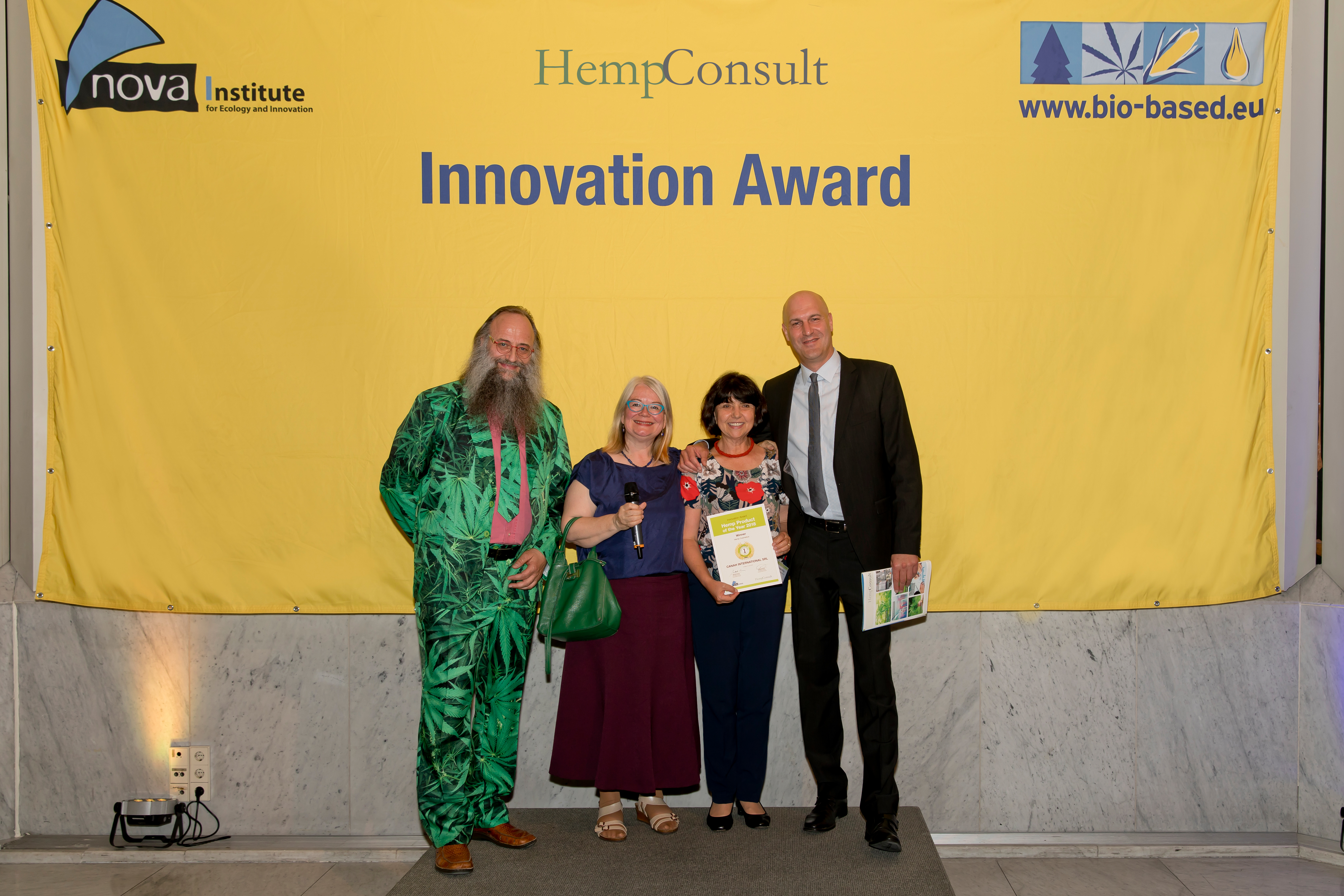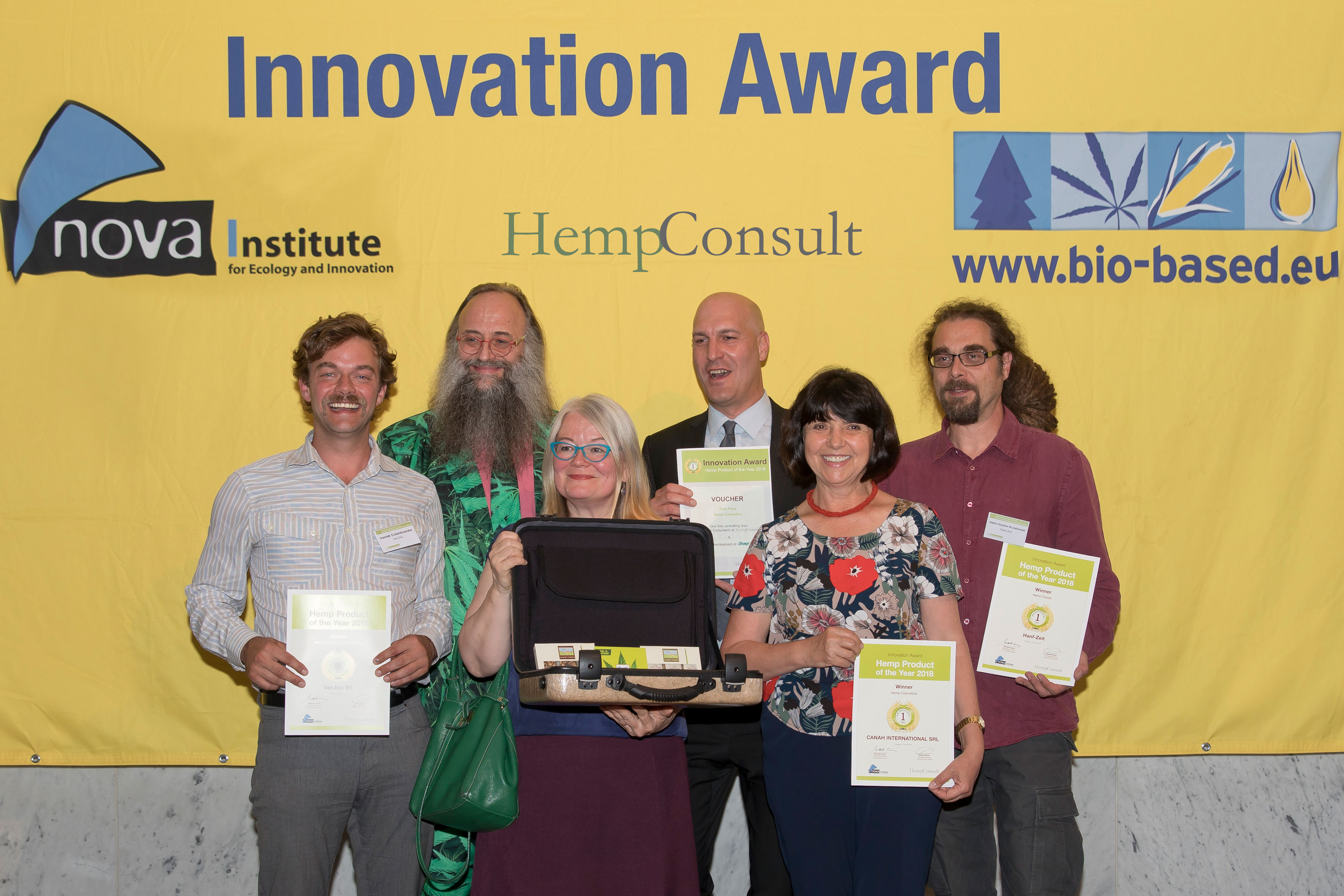 2018-06-20, Cologne – At the “15th International Conference of the European Industrial Hemp Association (EIHA)” 340 hemp experts from 41 countries met on 12 and 13 June in Cologne (Germany) for the world's largest industry conference and exhibition ever. The Innovation Award “Hemp Product of the Year 2018”, sponsored by the German company HempConsult GmbH, was presented for the first time in three categories. 40 products had been submitted, nine were nominated and three were chosen as winners by the participants of the conference after short presentations.