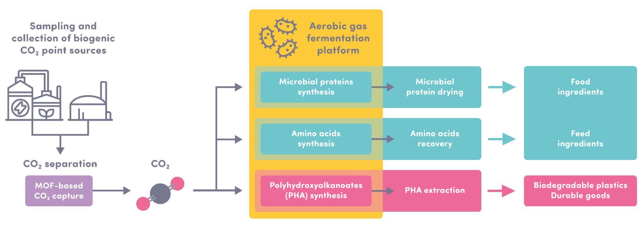 UNICO2RN integrates two complementary technological approaches. While metal-organic framework (MOF)-based systems are used for the efficient capture  of CO2 in high purity from biogenic point sources, the CO2 is then converted through aerobic gas fermentation using hydrogen-oxidising bacteria, which transform CO2 and hydrogen into microbial biomass and biopolymers.