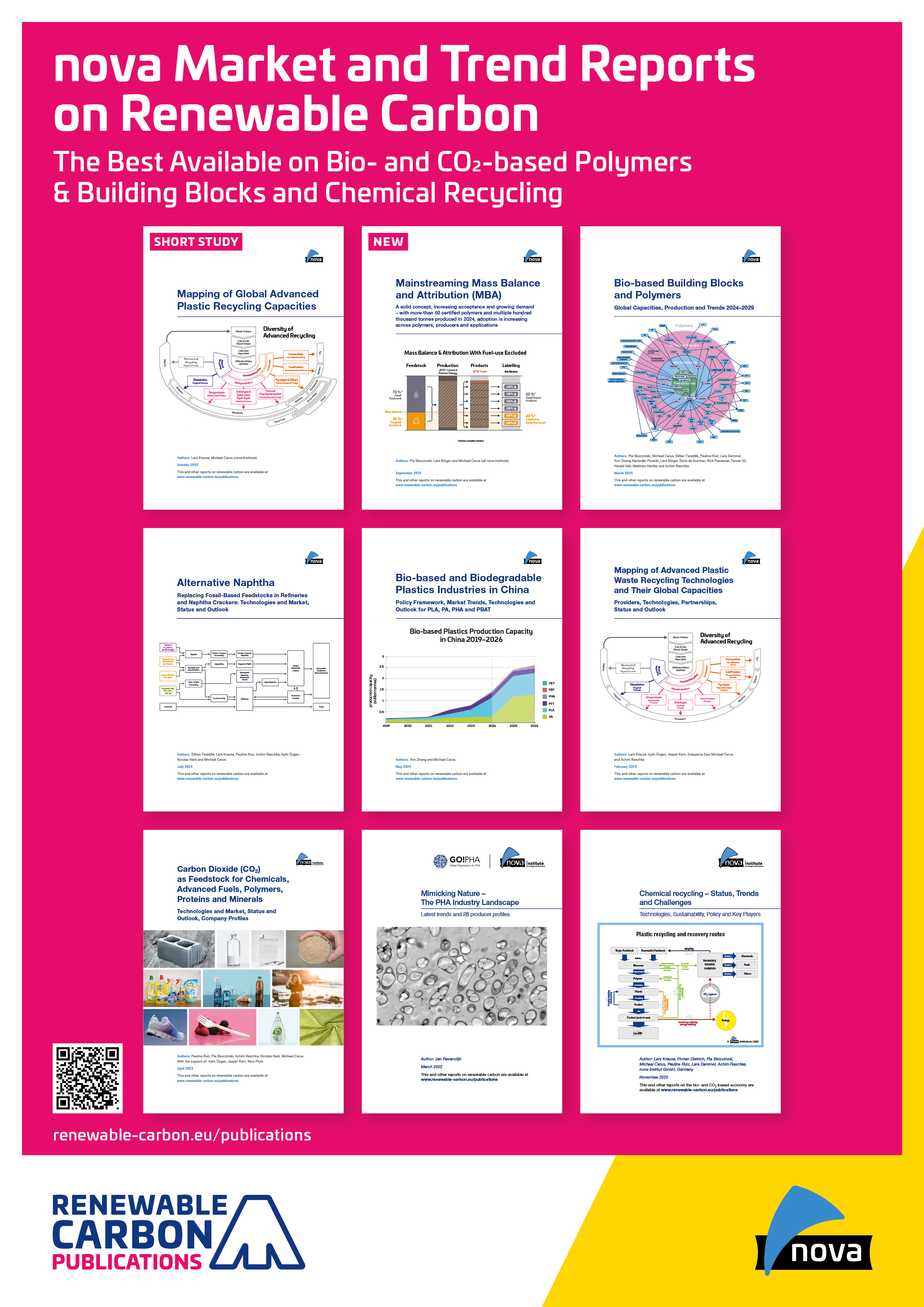 The latest reports are: Mapping of Global Advanced Plastic Recycling Capacities, Mainstreaming Mass Balance and Attribution (MBA), Bio-based Building Blocks and Polymers – Global Capacities, Production and Trends 2024–2029, Alternative Naphtha – Technologies and Market, Status and Outlook, and Bio-based and Biodegradable Plastics Industries in China. All commercial nova reports can be found here:Â