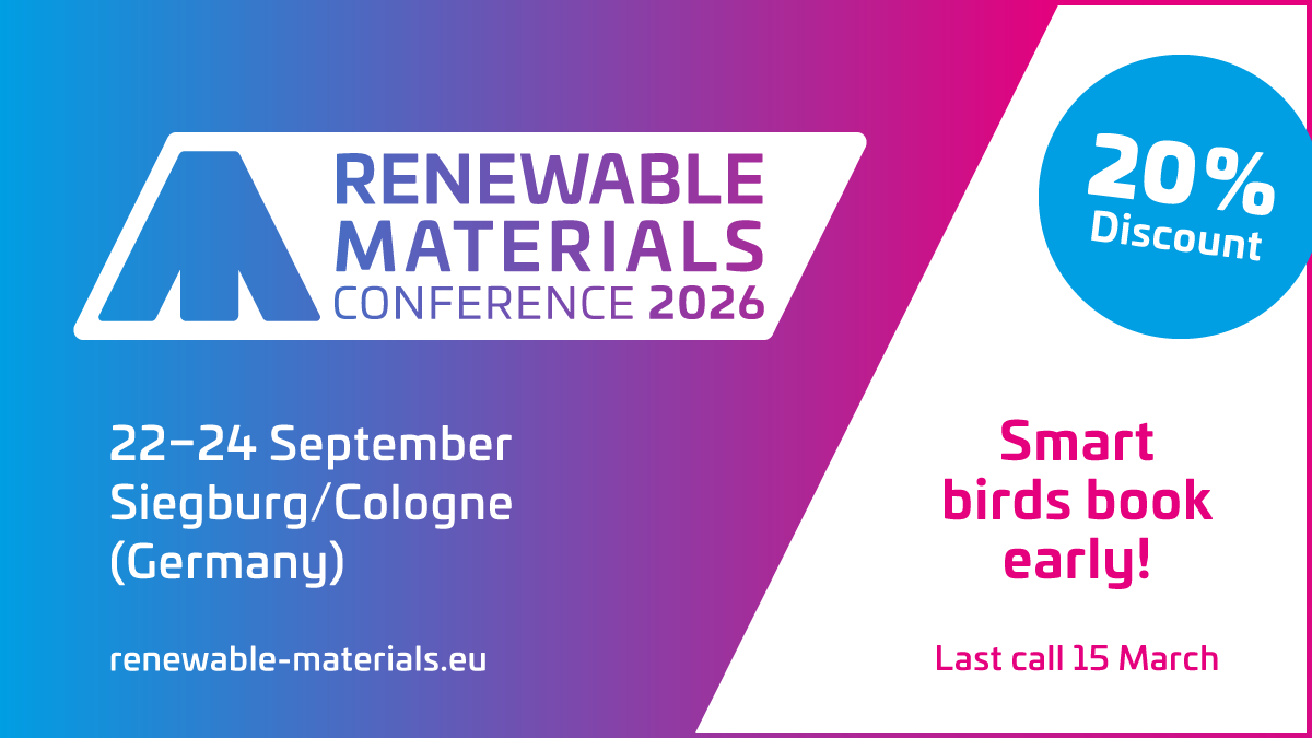Renewable Materials Conference from 22–24 September 2026 in Siegburg/Cologne (Germany): 80 presentations, 20 panel discussions, 16 workshops and an exhibition offer comprehensive networking with 400–500 participants